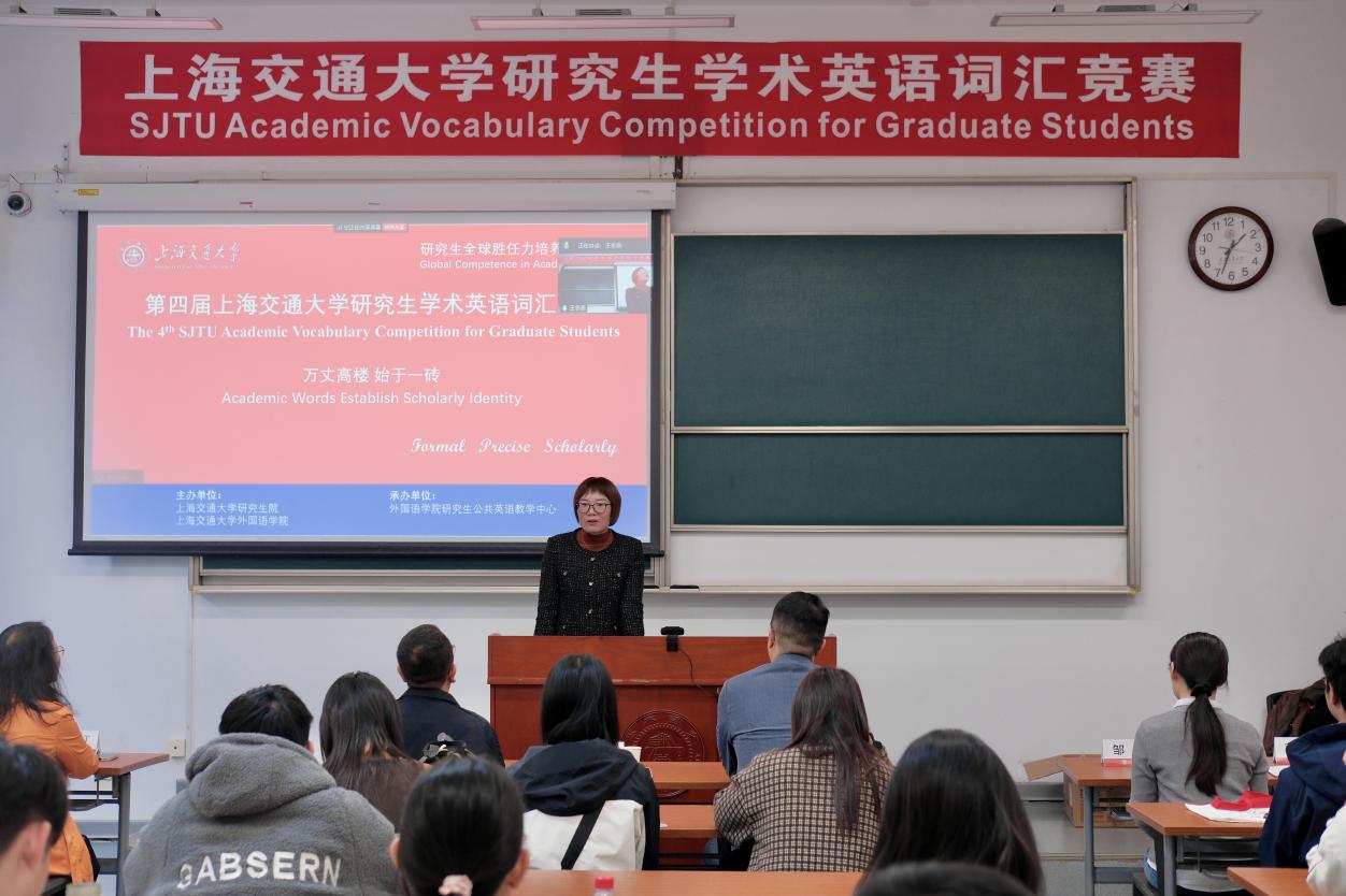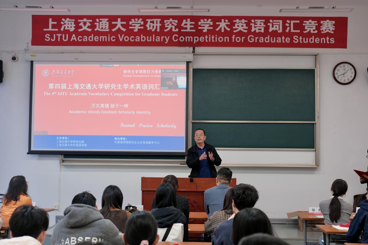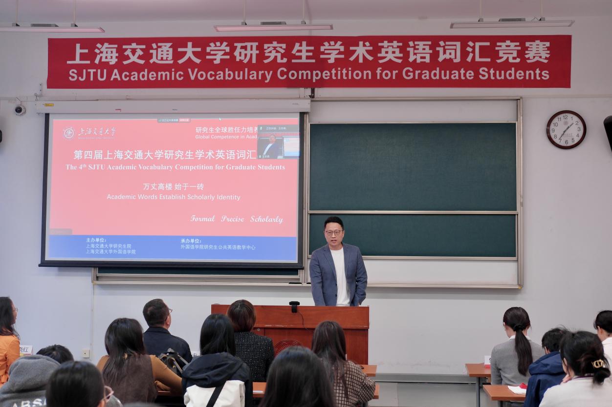 2025年11月12日下午,研究生全球胜任力培养系列比赛暨第四届beat365在线唯一官网研究生学术英语词汇比赛在闵行校区陈瑞球楼105室成功举办。大赛由beat365在线唯一官网研究生院、beat365在线唯一官网联合主办,beat365在线唯一官网研究生公共英语教学中心承办。自竞赛通知发布以来,受到全校师生的广泛关注,来自机动、船院、农生、计算机、材料、化工、法学、生科、自感、集电、人工智能等20多个学院各个专业共100余名硕博研究生踊跃报名参赛。beat365在线唯一官网研究生院培养办可尘娟老师、beat365在线唯一官网副院长甄风超、研究生公共英语教学中心主任李宏德、副主任杨晓红出席大赛。比赛由中欧工商学院博士生同学余欣主持。