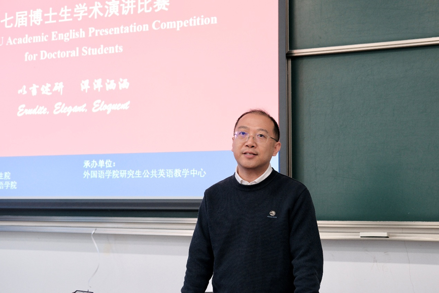 李宏德致辞。举办博士生学术英语演讲比赛已逾7个年头,他衷心感谢七年来研究生院的大力支持指导和公外研究生学术英语教学团队的持续奋斗、勤耕不辍。对历届博士生同学们的积极参赛他表示由衷的欣赏和热烈欢迎。学术英语书面语的重要性固然不言而喻,然而绝不能因此忽略了口语的重要性。通过援引语言的定义,他指出,口语第一,书面语第二。他希望同学们以演讲比赛的三个描述词“Erudite, Eloquent, and Elegant”为参照持续提升学术英语口语能力。