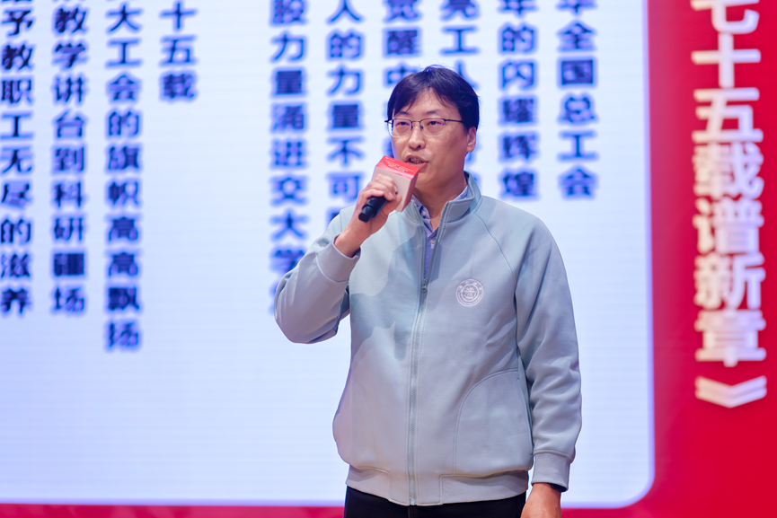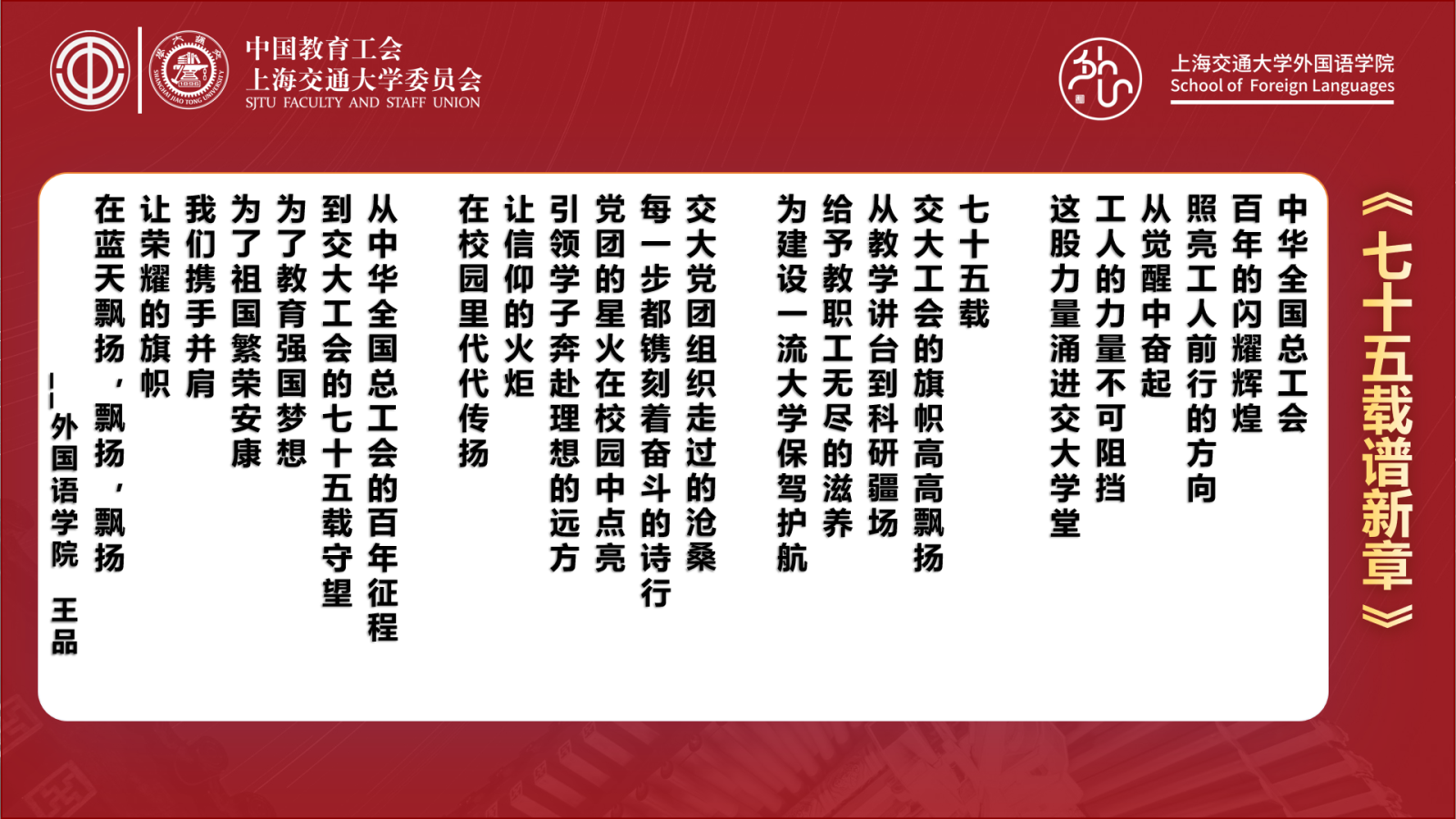 朗诵诗辞作品由王品老师原创。2025 年既是中华全国总工会成立100周年、“十四五”规划收官的关键之年,也是上海交大工会成立75周年的重要节点。作品立足三大重要时间坐标,回望中国工运百年峥嵘历程,深情弘扬劳模精神、劳动精神与工匠精神,生动展现交大教职工在新时代的使命担当,着力激发全体师生爱党爱国爱校的炽热情怀,为学校建设世界一流大学目标凝聚起同心奋进的磅礴力量。