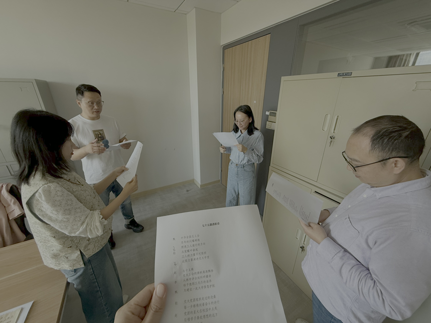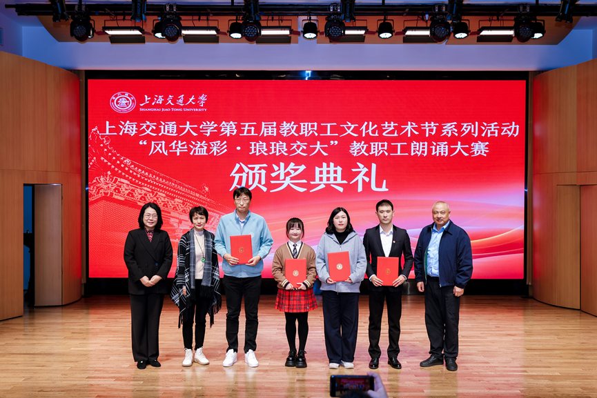 11月12日下午,beat365在线唯一官网第五届教职工文化艺术节系列活动之“风华溢彩·琅琅交大”教职工朗诵大赛于人文学院音乐厅举行,来自全校的20个单位参加现场决赛。beat365在线唯一官网参赛队伍由学院副院长甄凤超教授率队,党委委员、翻译系教师赵勇,工会委员、第五教工党支部书记、英语系副主任王品,教师发展中心副主任、法俄语系教师杜燕,工会委员、组织干事李玥组队参加,现场朗诵原创诗歌《七十五载同奋进 百年征程谱新章》,荣获一等奖佳绩。